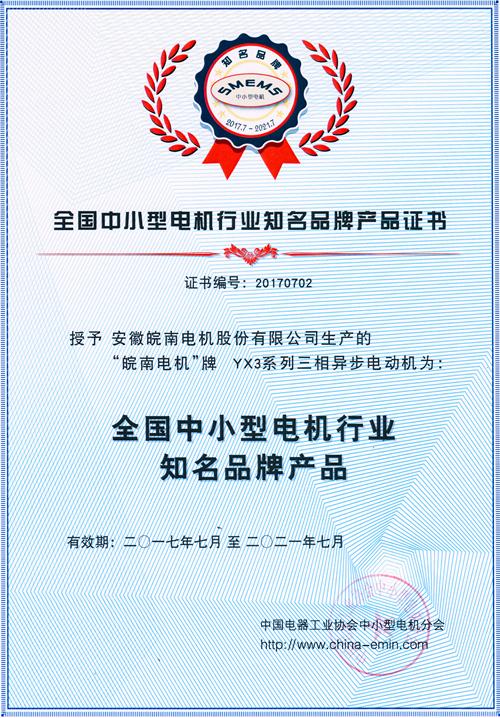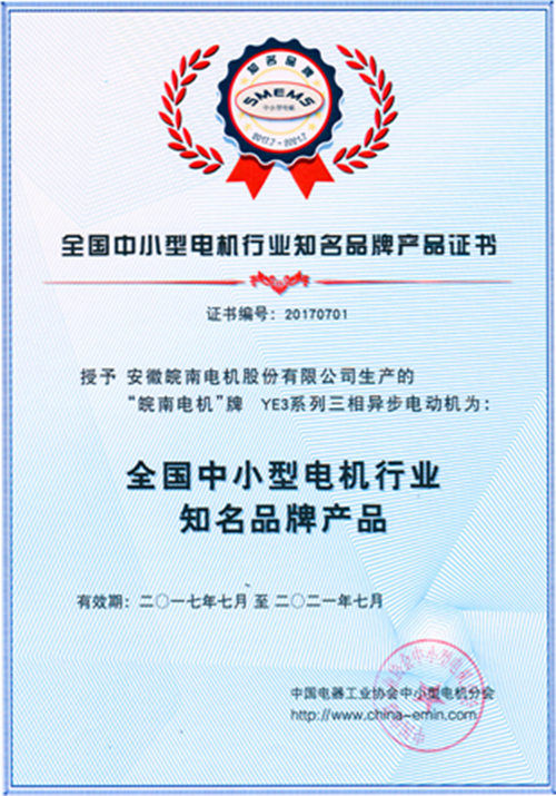 皖南电机荣获 “全国中小型电机行业知名品牌产品”称号
